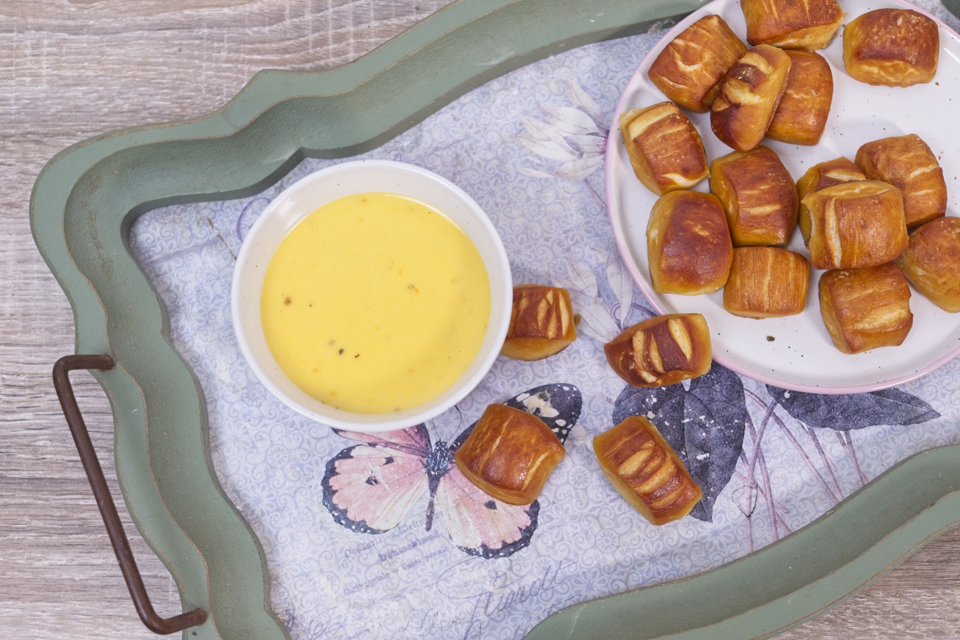 Mini-Laugen-Häppchen mit Cheddar-Soße